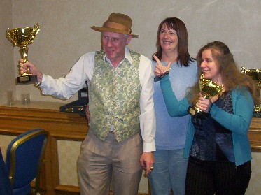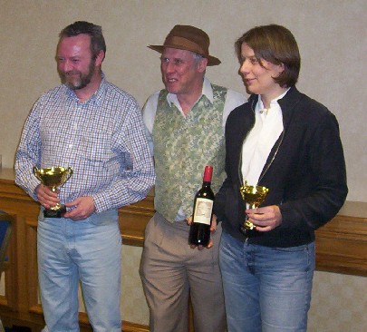 ![]() | "Haggis" winner Martin, with Slatts and runner-up Vicky Chandler. Martin refused to be photographed with his bottle of white wine -- definitely the wrong colour! Vicky had grabbed the last red. |