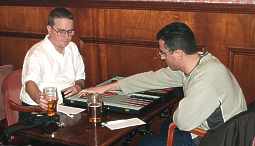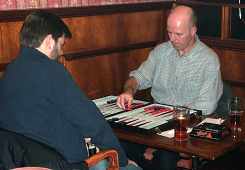 Stuart Mann (right) kicks off his 2002 Premier League campaign with a victory over Charlie Hetherington. Charlie was runner-up in 2000, Stuart emulating that achievement last year. | |