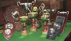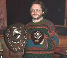LEFT: Ian Preston has every reason to be pleased as he holds the Bristol Open Grand Prix shield and his memento.RIGHT: John Slattery, having already received the Premier League championship trophy, memento and cash prize, returns to the "podium" to receive his runner-up prizes from the Open Grand Prix. | ![]() |