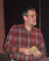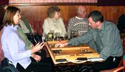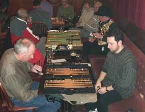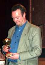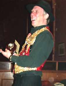 LEFT: Trophies awaiting presentation at the BCSC on Awards Night.RIGHT: Host Ian Tarr in full flow, delivering his "Bristol Backgammon Review of 2001", still had time to present himself with a buff envelope containing the prize for finishing 3rd in the Premier League. | ![]() |