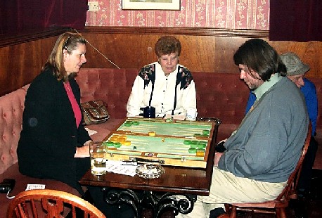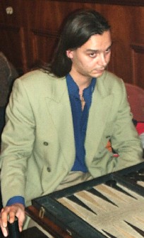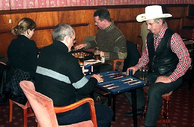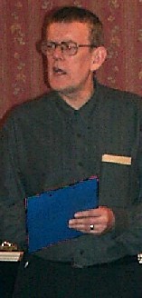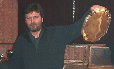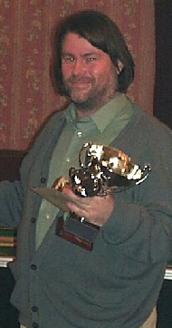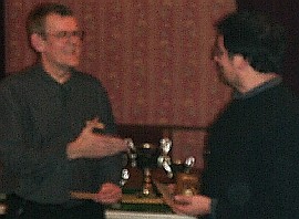 | BELOW: Host Ian Tarr reels off his "Bristol Backgammon Review of 2002". ![]() BELOW: A resplendent John Slattery celebrates his retention of the Bristol Premier League title, the reward for outstanding consistency. |