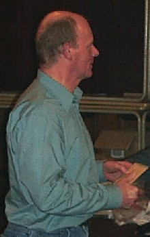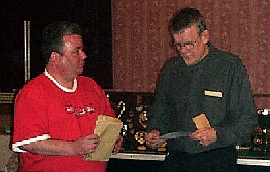 LEFT: "What's this?" Ian Tarr seems to be saying. The totally gobsmacked (and hugely chuffed) host has just received some vouchers for accommodation at BIBA events, after a whip-round amongst the players was masterminded by Neil Young. |