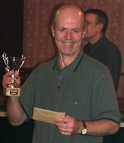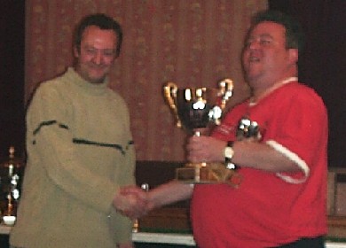 LEFT: Sponsor Martin Hemming hands over the inaugural award to the player adjudged to have made the greatest strides during 2002. Neil Young, IGP champion, double tournament winner, and Conference third placer, fits the bill superbly. |