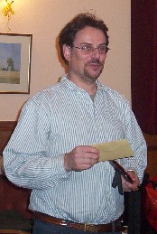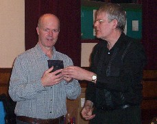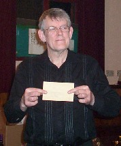 The players of Bristol Backgammon showed their appreciation of the efforts of the Director Ian Tarr with a card and a collection which will take care of Ian's expenses at the forthcoming Cotswold Fireside Tournament in Stroud. Neil YounG, the surreptitious collection organiser is seen making the presentation to a very grateful Ian![]() @@RH@@ |