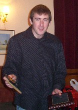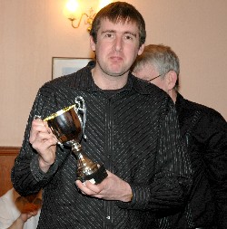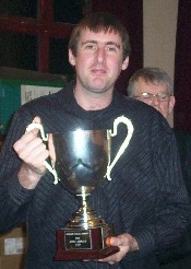 Nick Barham with the largest of the trophies he collected on the night, the John Chidgey Cup, which is awarded to the winner of the December grand prix tournament![]() **CR** |