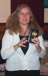There were two spare bottles of wine, so sponsor Ed Turner decided to award one to chief heckler Simonetta Herrera -- at least, I think that was what it was for. Photographer for the evening, Cynthia Roberts got the other one![]() **CR** |