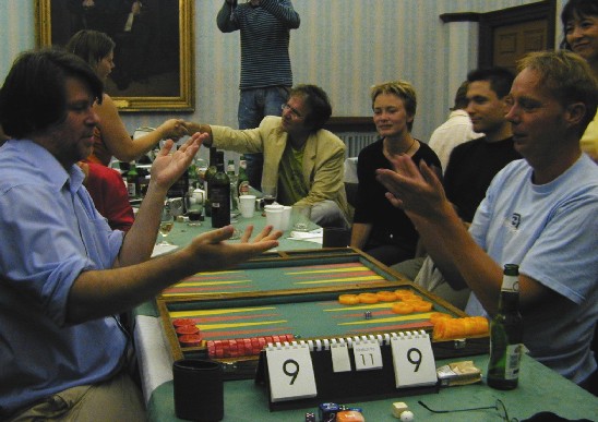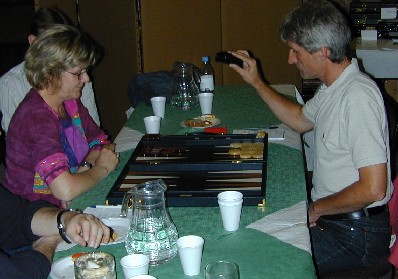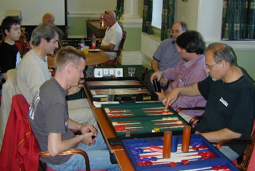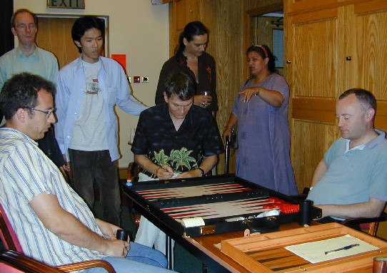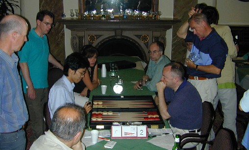Where there are backgammon players, there are chouettes. Mark Dixon (left) and Martin Barkwill are in the thick of the action here, while Peter Bennet jots down a position. Lawrence Powell and Mochy Masayuki look on, while Juanita Ferrer makes a point to Jason Champion. |