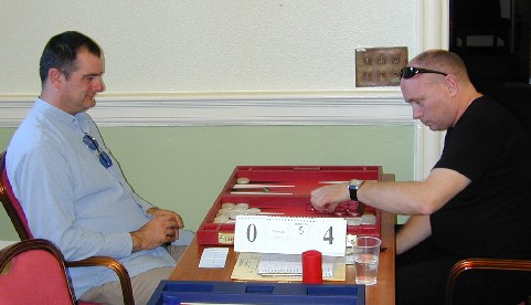 You can just feel the tension, as Mochy Masayuki and Martin Barkwill embark on their Pro Category Main Final, the centrepiece of the entire weekend (apart from the wedding, of course!) Interested onlookers are: standing, left to right Stuart Mann, Adrian Herrera, and Richard Edgecliffe-Johnson; seated are Simon Fahoury (foreground), Fanika Petkovska and Chris Roberts. On the mantlepiece behind them all are the glittering prizes on offer for the weekend's winners. |